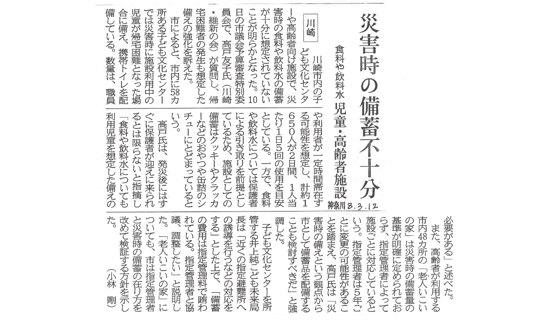 この予算審査特別委員会での質疑を受け、神奈川新聞(2026年4月3日付)において、災害時の備えの課題が報じられました 。記事では、指摘した内容が詳しく紹介されています。