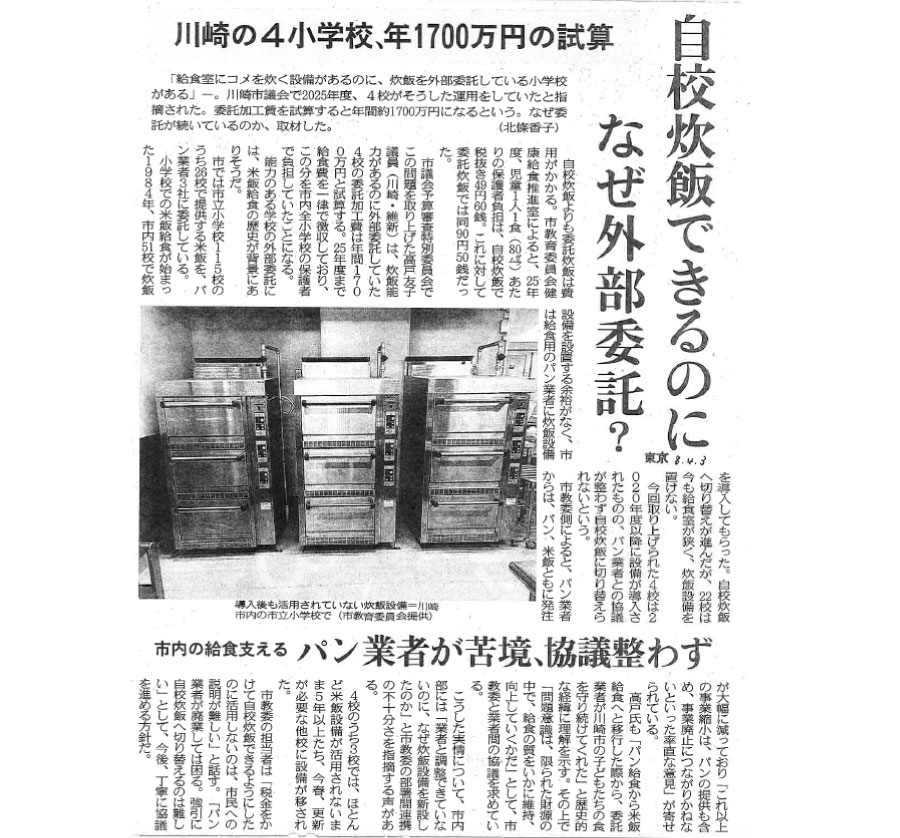 2026年3月12日付の東京新聞において、予算審査特別委員会での質疑内容が大きく取り上げられました 。記事では、本市の小学校給食における「委託炊飯」が、自校炊飯に比べて1食あたり約41円割高となっている実態が報じられています 。これにより生じている年間約1億円規模の財政負担という具体的な数字とともに、給食無償化という新たな局面において、限られた財源をいかに「食の質の向上」へ最適に配分していくべきかという当職の問題提起が紹介されました 。
